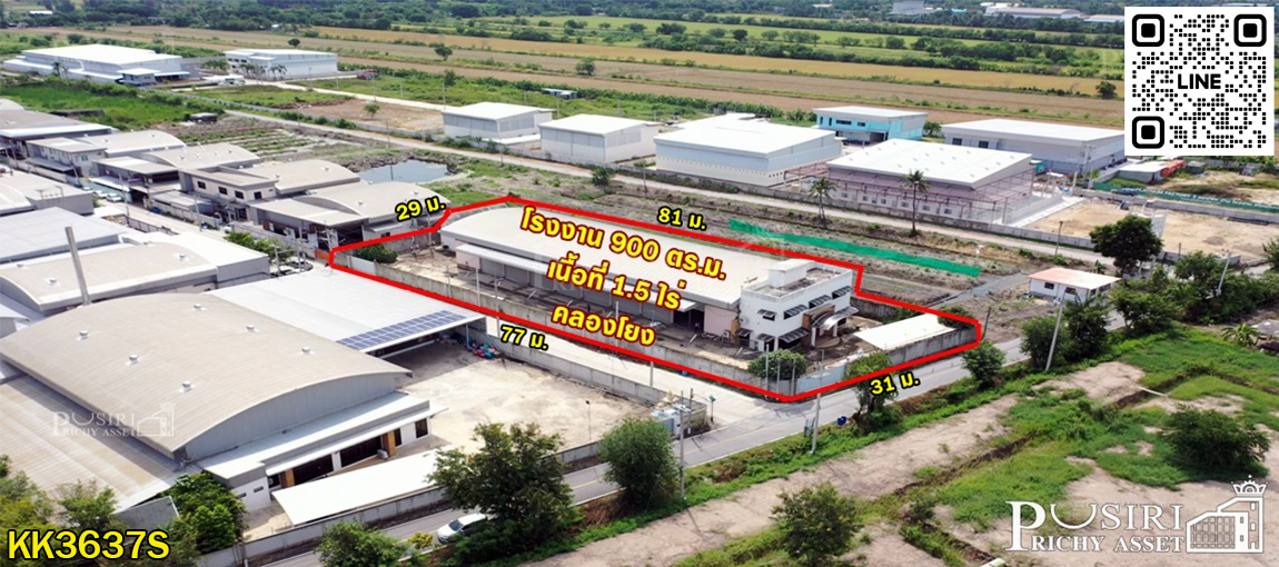 โรงงานสภาพใหม่ตั้งอยู่บนพื้นที่ 1.5 ไร่ ด้วยรูปทรงสี่เหลียมสวย หน้ากว้าง 77 เมตร เข้าออกสะดวกด้วยประตูทางเข้า 2 ด้าน ติดถนนทั้ง 2 ฝั่ง พื้นที่ใช้สอยตัวโรงงาน+ออฟฟิศ ทั้งหมด 900 ตารางเมตร ใช้งานง่ายด้วยประตูที่เป็นระบบไฟฟ้าทั้งหมด พร้อมการเดินทางที่สะดวกใกล้มอเตอร์เวย์ตัดใหม่ บางใหญ่-เมืองกาญ